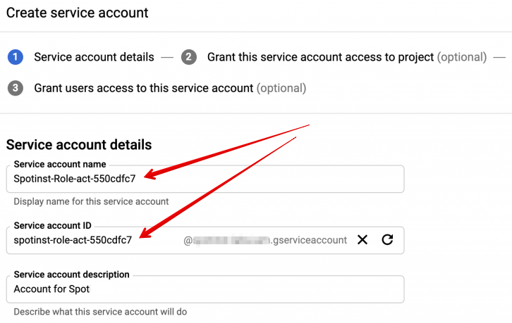 3. In GCP, paste the name into the Service Account Name and Service Account ID fields. Click Create.