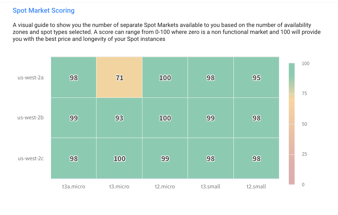 Once VPC, Subnets, Product, Image and Preferred Node type are selected, Spot will automatically preselect optional similar Spot Markets to ensure optimized cost efficiency. The Spot Market Scoring Table on the right side will be populated: