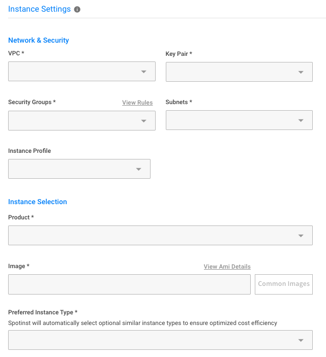 Configure Network and Security settings such as VPC, Key Pair, Security Groups, Subnets and Node Profile.