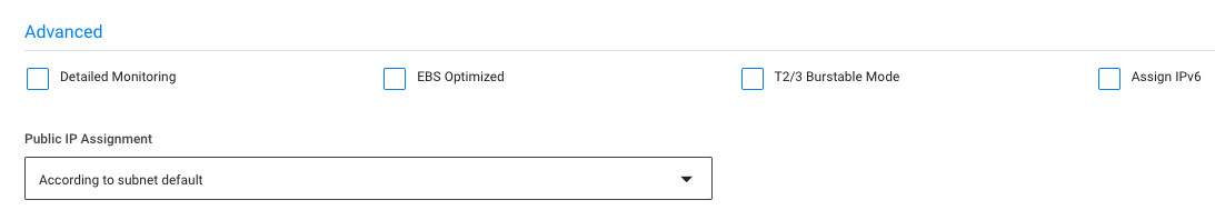 Enter any additional settings such as detailed monitoring for Amazon CloudWatch, EBS optimization, Burstable CPU for T2 or 3 nodes, IPv6 assignment and Public IP assignment.