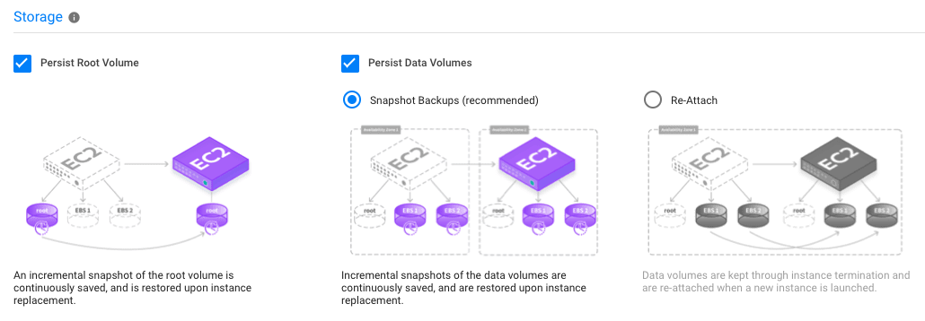 - Re-Attach: Data volumes are kept through node termination and are re-attached when a new node is launched.